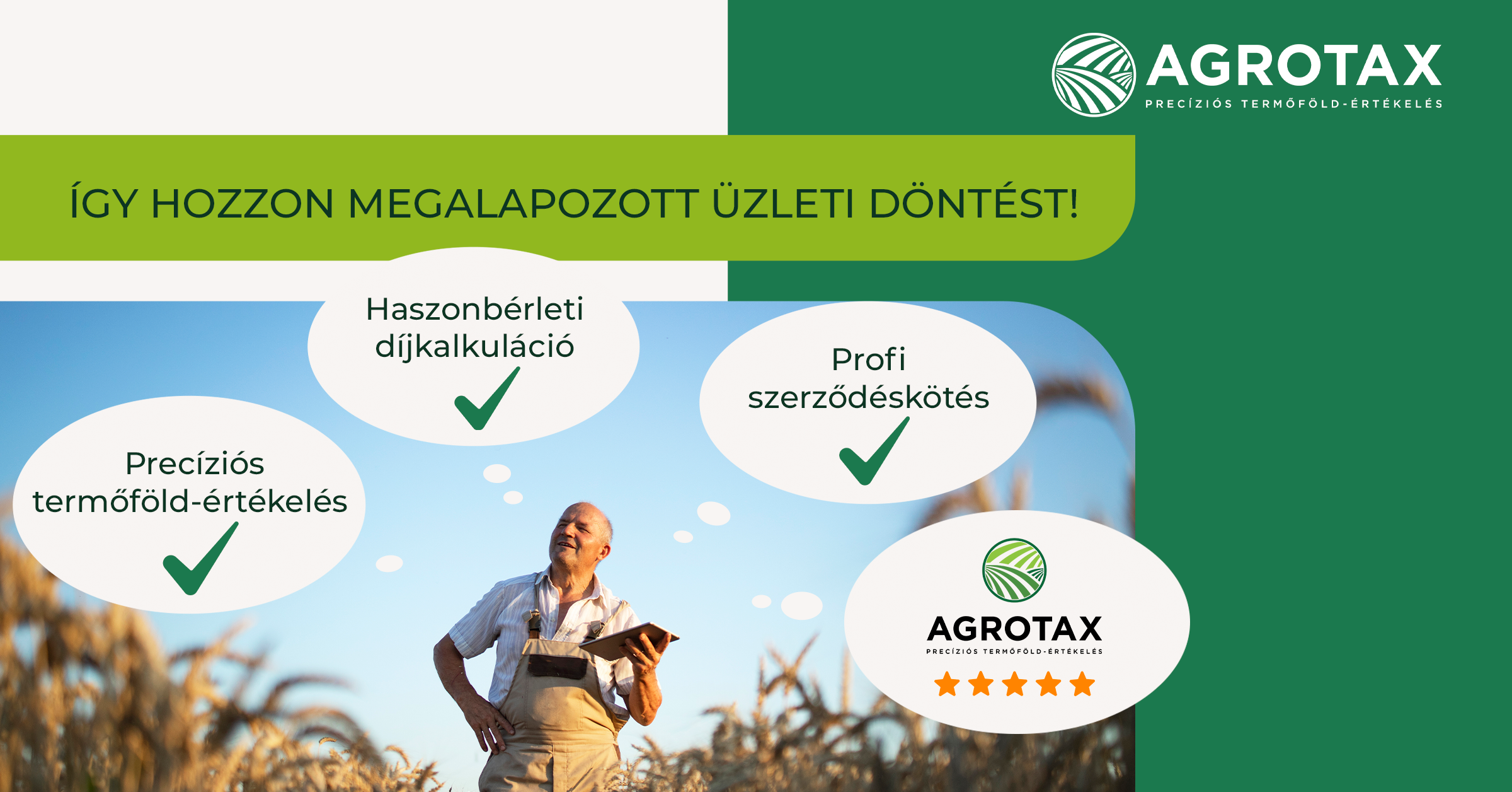 Hogyan jelenhet meg felkészülten a díjtárgyaláson, melyen az új haszonbérleti szerződésedről lesz szó? Mi sem egyszerűbb ennél! Az Agrotax – Magyarország első – digitális értékelő kalkulátora 24 órán belül megállapítja a helyben szokásos, illetve a föld műszaki-diagnosztikai adataival korrigált, reális, egyedi bérleti díját.